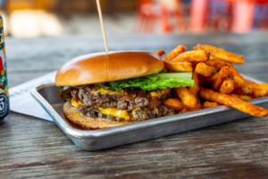 - DOUBLE SMASH BURGER & FRIES $15 – Two smash patties, smoked Gouda cheese, caramelized onions, lettuce, tomatoes, and yum yum sauce on a brioche bun served with fries